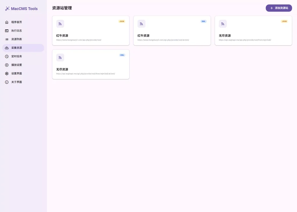- 多协议无缝适配:原生支持XML与JSON格式的资源站API,灵活对接各类标准接口。